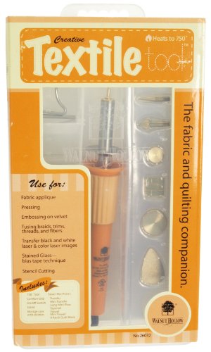 WALNUT HOLLOW-The fabric and quilting companion. Use for fabric applique pressing embossing on velvet fusing braids trims threads and fibers transfer black and white laser and color laser images stained glass-bias tape technique and stencil cutting. Includes 750 degree tool comfort grip on/off switch stand storage case with dividers and 7 hot points: transfer mini transfer long mini-flow tapered trowel mini trowel and 9 patch quilt block. UL listed 1K69 E76789. 16.5 watt 120 volt. Caution: Hot tool can cause severe burns. Use carefully and keep away from combustible materials. Not suitable for