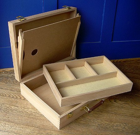 This beautiful wood box has five fixed compartments inside for holding brushes paints and other art supplies. The lid holds a wood palette that swivels out. There is room behind the palette for a canvas panel or a sketch book. The box measures 16-1/2 x 12-3/4 x 4-3/4 inches. This large box has a lift out tray inside. The tray has four large compartments for holding your art supplies. Sturdy wood construction with brass hardware and a comfortable handle.
