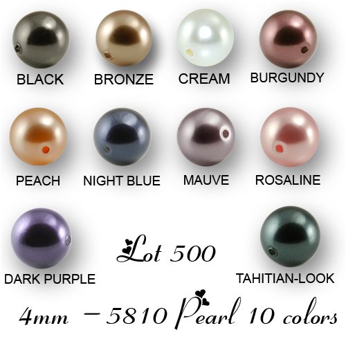 ++ Genuine Austrian Swarovski Crystal Pearl beads of the highest quality. ++ Size: 4mm. Shape: Round (5810). ++ 500 beads total. 10 colors (50 beads of each color). ++ Colors: Cream, Rosaline, Peach, Burgundy, Dark Purple, Mauve, Black, Bronze, Tahitian-Look, Night Blue.